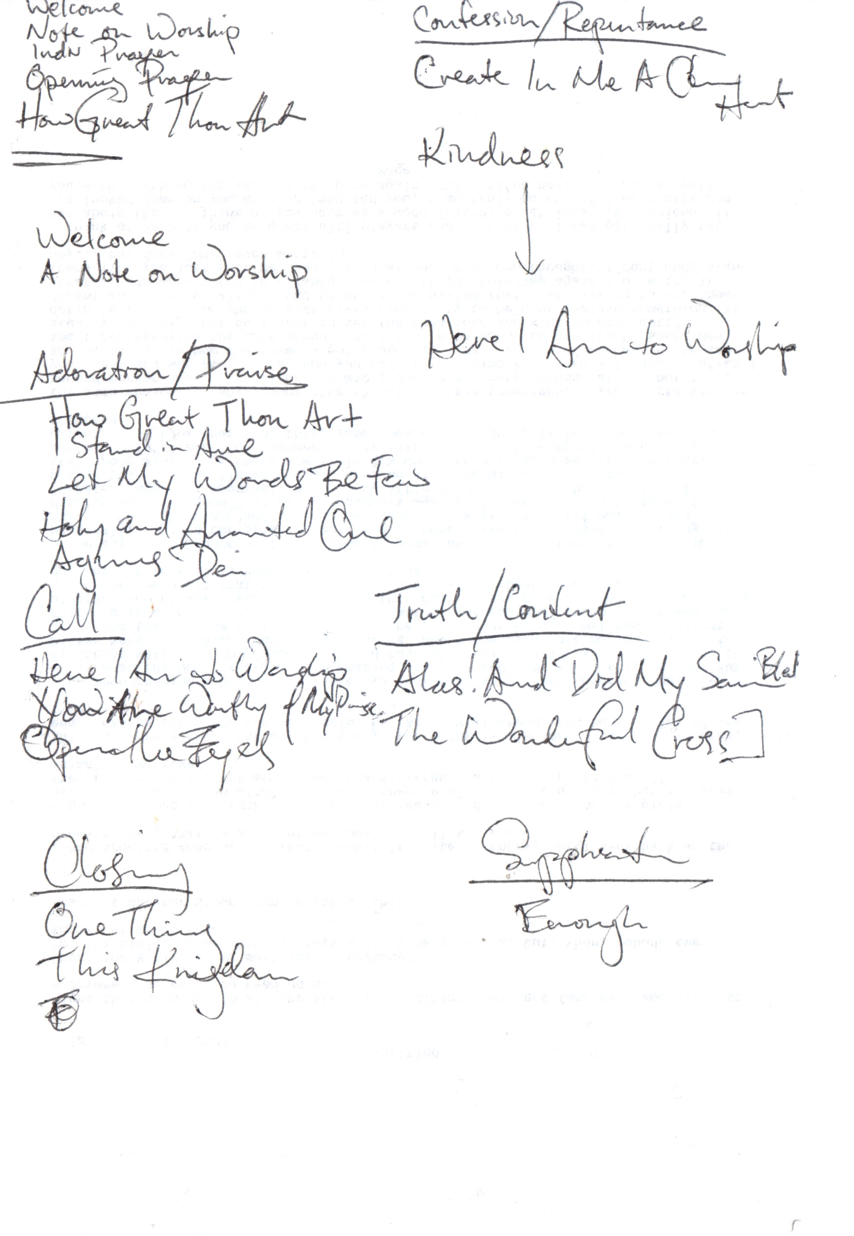 anyway, it’s such an interesting find because it’s a look into my 17/18 year old worship leading self. i know from looking sheet that it is a planning/brainstorming sheet for a prayer & worship meeting because it follows an ACTS (adoration, confession, thanksgiving, supplication) rubric that i used to employ often. it looks like i started over a few times or added a bunch of subheadings. i know i’ve modified this rubic since, simplifying it to just BIG God, little us, the cross, and our response (yeah i don’t have a cool acronym for this one).